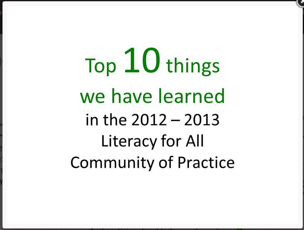 A top ten list of what we learned can be a great starting point for reflecting and discussing shifts in practice and results for students. For example, the facilitator can compile evidence from webinars, online meetings and participants’ discussions to create a list of one-line statements that summarize key the learning from the work of the community. Using a traveling brainstorming strategy, participants then work in small groups and discuss and add to each item on the list. The result will be an expanded description with authentic examples for each statement of learning